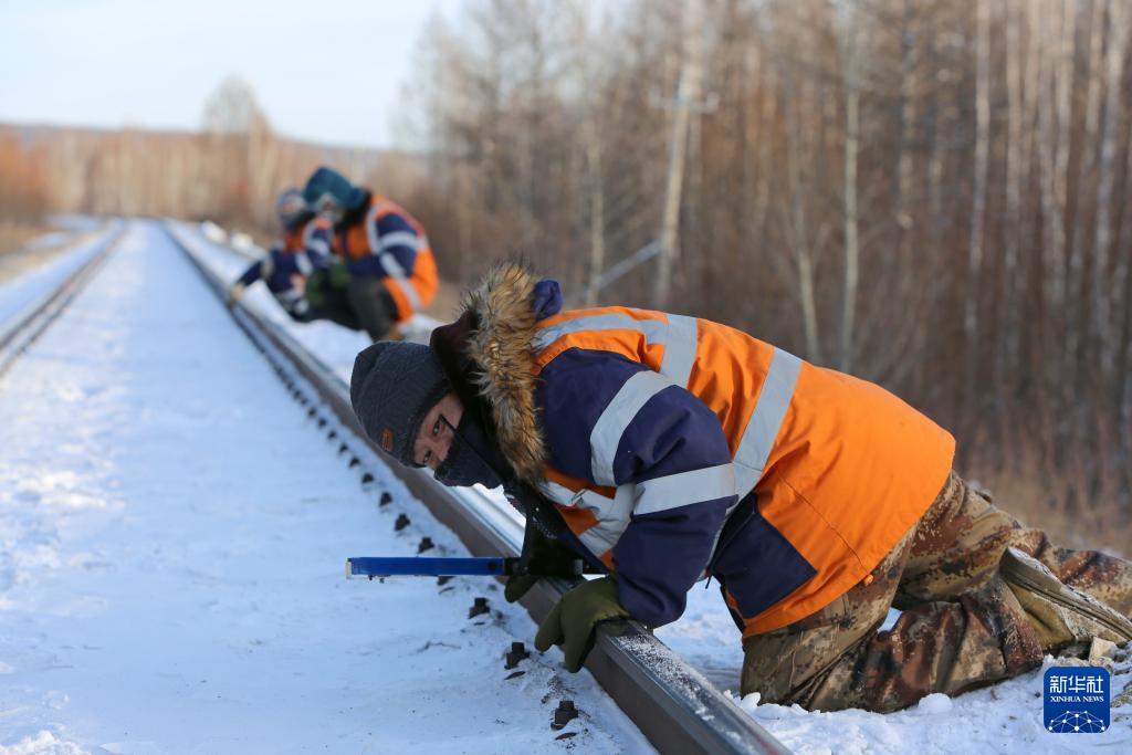 12月20日,在中国铁路哈尔滨局加格达奇工务段,漠河车间带班工长趴在钢轨上目测现场坑洼情况,确定作业位置。新华社记者 石枫 摄