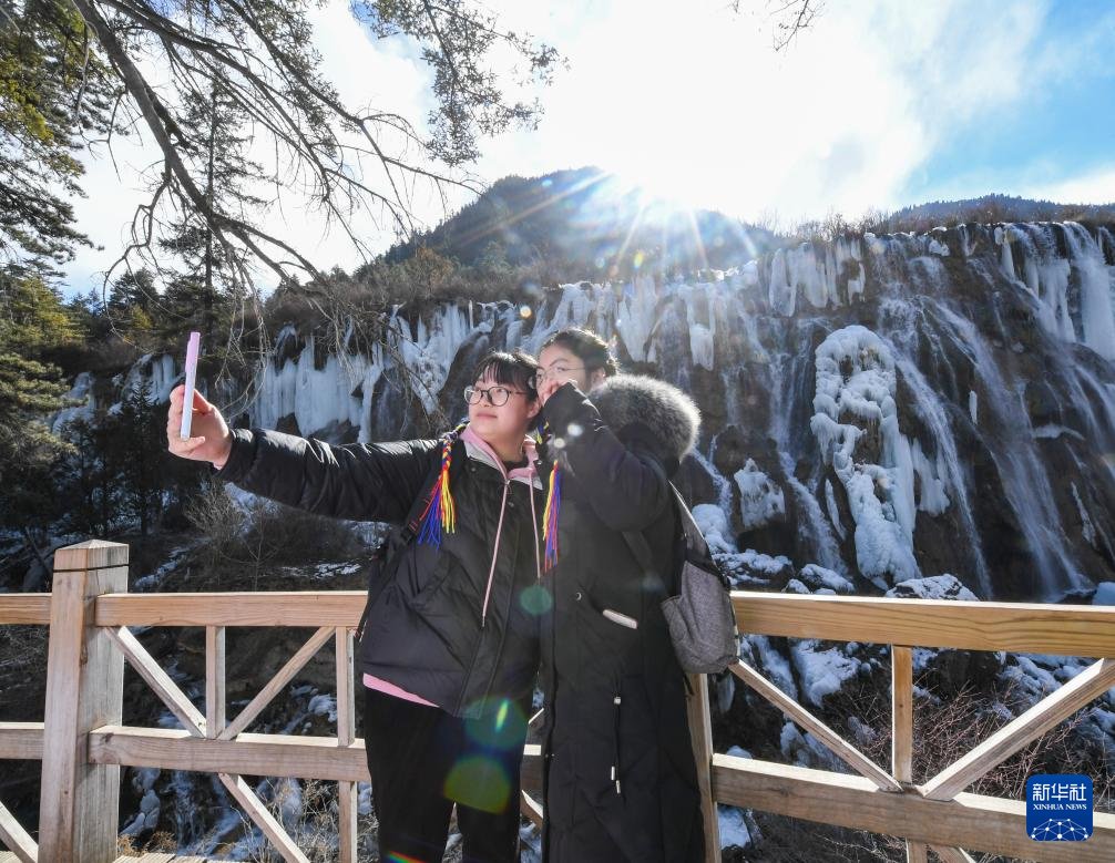 1月4日,游客在九寨沟风景名胜区冰瀑景观前留影。