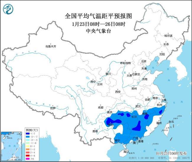中央气象台1月23日06时继续发布低温蓝色预警:预计,1月23日至25日,贵州、湖南、江西、浙江中南部、福建西部、广东、广西中东部等地最低气温或平均气温较历史同期偏低5℃以上。