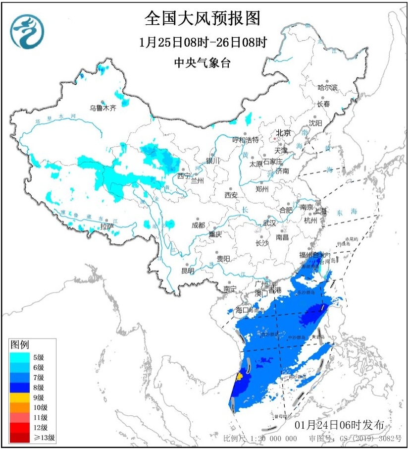 预计,1月24日08时至25日08时,福建沿海、广东沿海等地的部分地区有5~6级、阵风7~8级的大风;黄海大部海域、东海大部海域、台湾海峡、台湾以东洋面、巴士海峡、北部湾、南海大部海域将有7~8级、阵风9~10级的大风,其中南海西南部的部分海域风力可达9级、阵风10级。