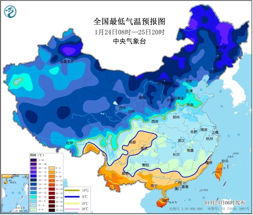 中央气象台1月24日06时继续发布低温蓝色预警: