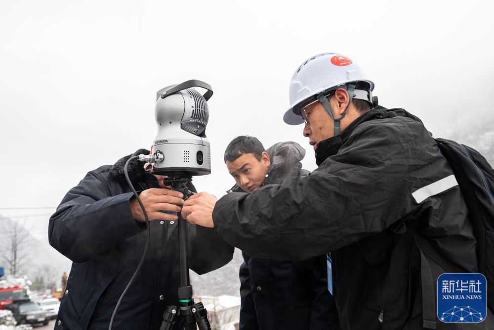 1月24日,国家隧道应急救援中铁二局昆明队中队长熊丹(中)在救援现场的便携式边坡雷达与轨道式边坡雷达阵地工作。新华社记者 江文耀 摄