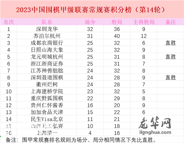 本轮结束后,深圳龙华队以1分的优势力压苏泊尔杭州队,登上榜首。常规赛还剩最后一轮,深圳龙华队将于客场挑战加加食品天津队。