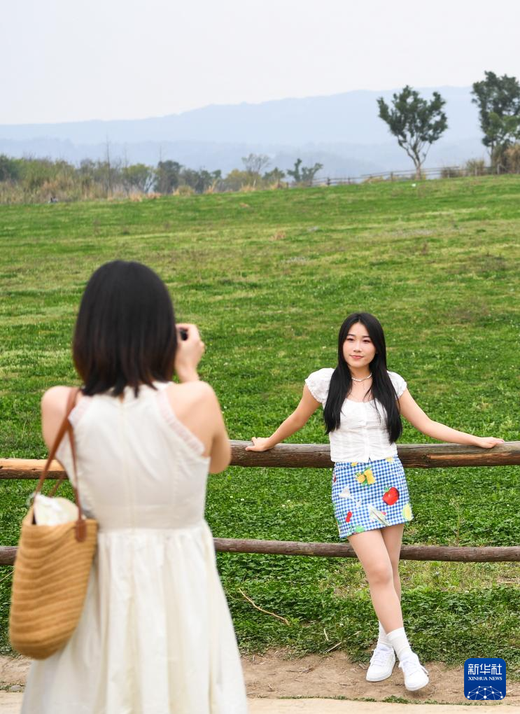 3月16日,游客在重庆广阳岛胜利草场游览、拍照。新华社记者 王全超 摄