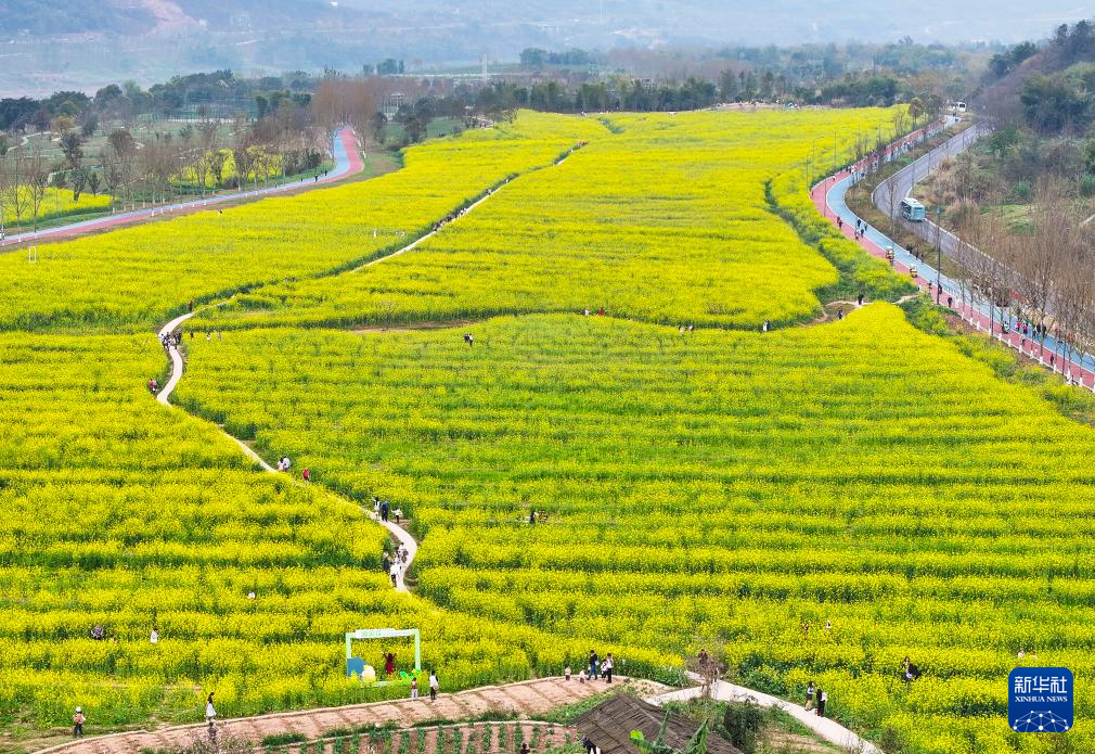 3月16日,游客在重庆广阳岛油菜花田游览(无人机照片)。新华社记者 王全超 摄