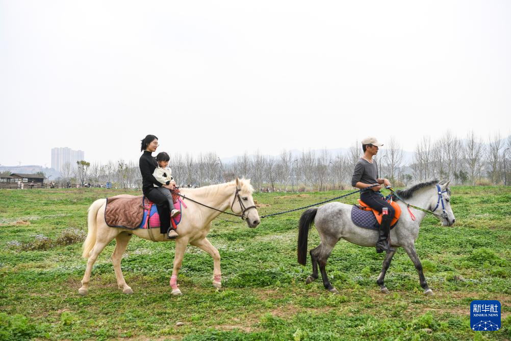 3月16日,游客在重庆广阳岛胜利草场体验骑马。新华社记者 王全超 摄