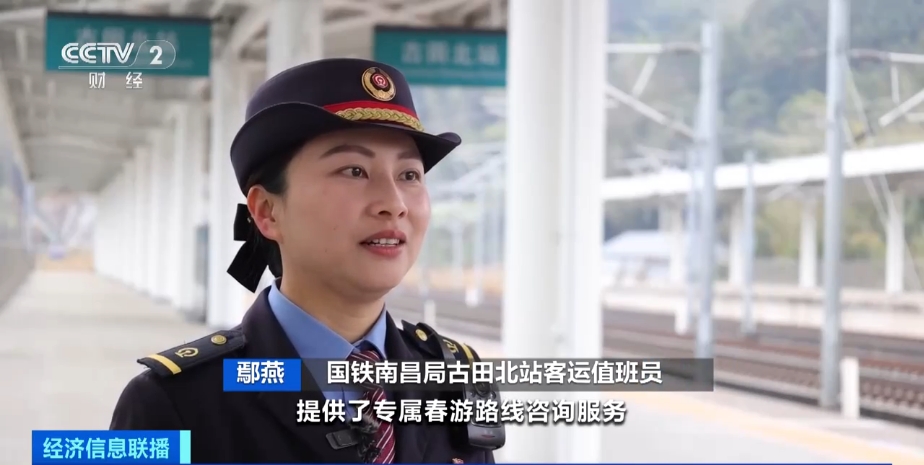 国铁南昌局古田北站客运值班员 鄢燕:我们在出站口提供了专属春游路线咨询服务,旅客根据我们的推荐,乘坐景区直通公交体验赏花、品尝特色美食、观看民俗表演等“一站式”春游服务。