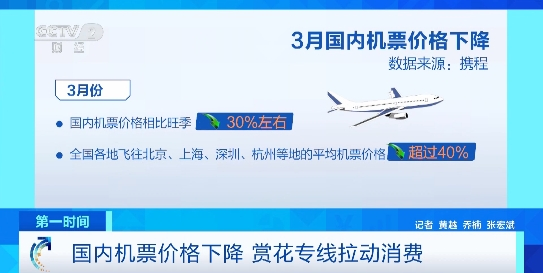 携程公共事务部总监 陈理楠:比如北京到安徽,北京到云南,上海到杭州等等,这些航线都很热门,航班整体机票的价格较之前有了较大幅度的回落。