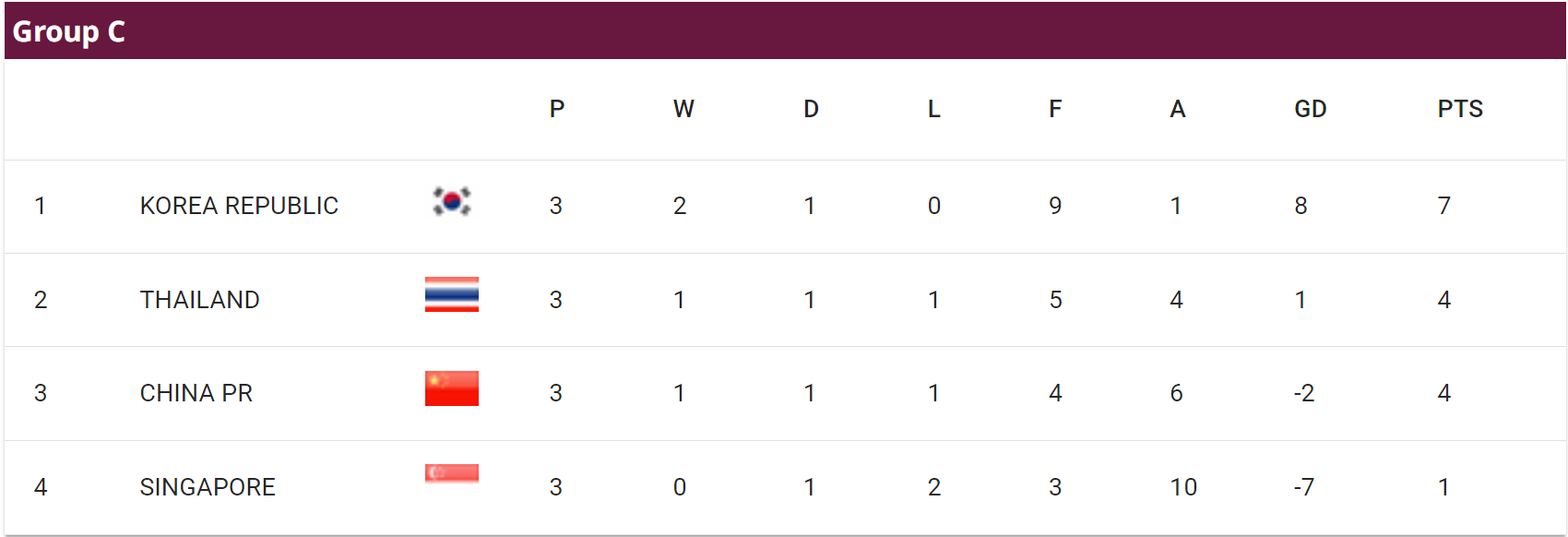在同组的另一场比赛中,韩国队主场遭泰国队1-1逼平。3轮过后,中国队一胜一平一负积4分,以净胜球劣势暂居小组第三。3月26日晚20:00,中国队将回到主场,在天津再次对阵新加坡队。