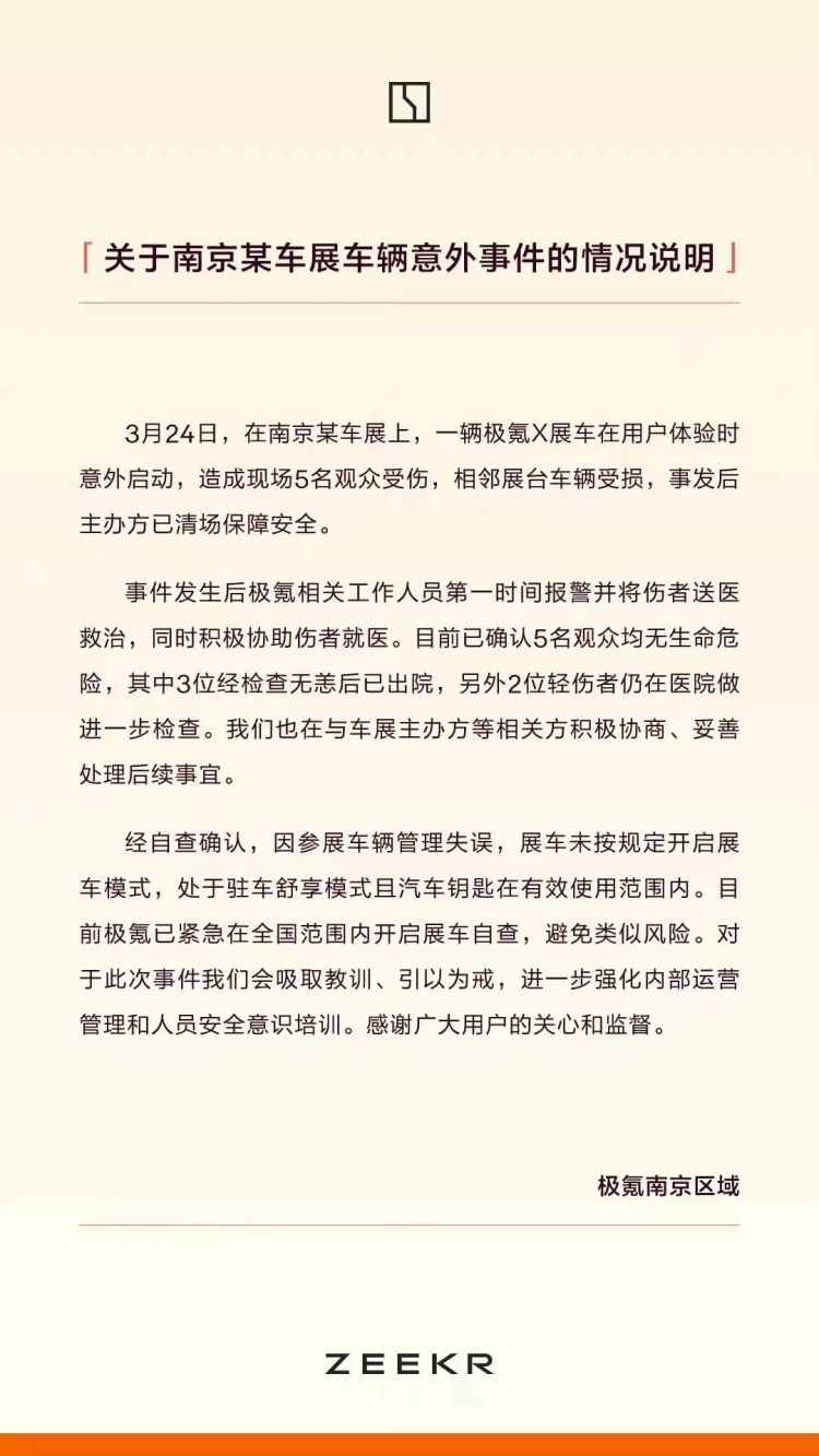情况说明介绍,3月24日,在南京某车展上,一辆极氪X展车在用户体验时意外启动,造成现场5名观众受伤,相邻展台车辆受损,事发后主办方已清场保障安全。事件发生后,极氪相关工作人员第一时间报警并将伤者送医救治,同时积极协助伤者就医。目前已确认5名观众均无生命危险,其中3位经检查无恙后已出院,另外2位轻伤者仍在医院做进一步检查。极氪也在与车展主办方等相关方积极协商、妥善处理后续事宜。