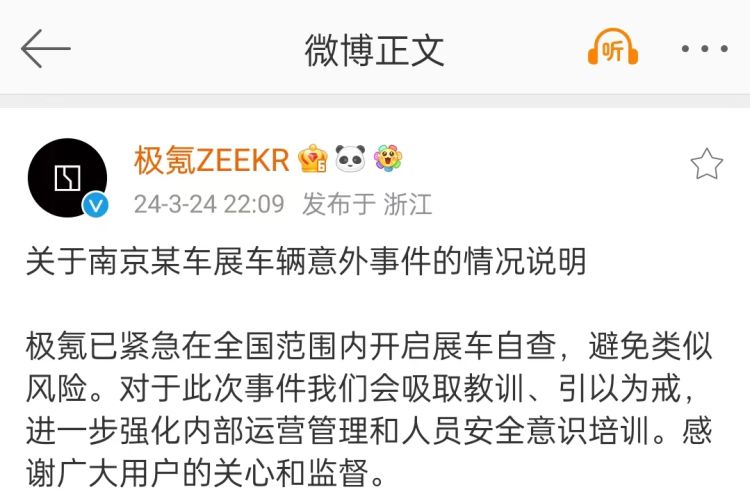 南京展车撞伤5人?极氪3月24日晚间于其官方微博发布情况说明称,因参展车辆管理失误,有极氪展车在用户体验时意外启动,造成现场5名观众受伤,送医后确认均无生命危险。