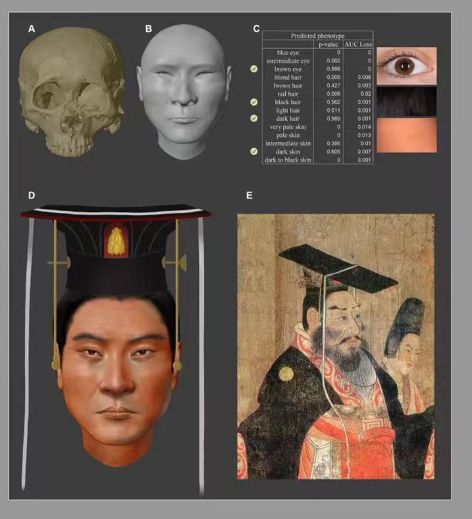 复旦大学科技考古研究院文少卿团队用专门适用于古DNA的捕获探针,从北周武帝肢骨样本上获取了约100万个可用的基因位点,还原北周武帝头发、皮肤、瞳孔等关键特征。经过6年的反复尝试,终于“描绘”出宇文邕头像。