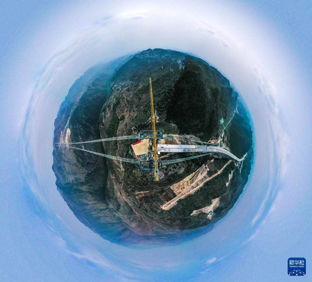 这是3月27日拍摄的花江峡谷大桥建设场景(无人机全景照片)。新华社记者 杨文斌 摄