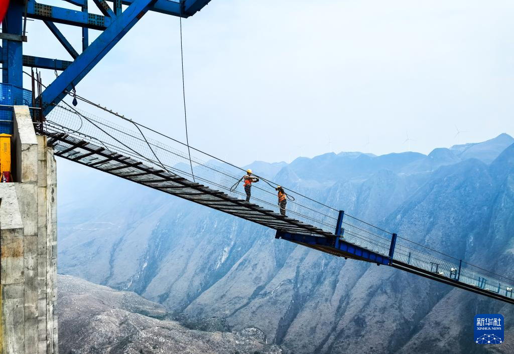 3月27日,工人在花江峡谷大桥的施工猫道上加固防护网(手机照片)。新华社记者 杨文斌 摄