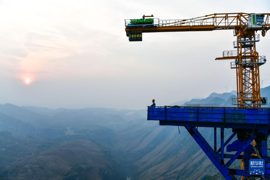 3月26日,一名工程师在花江峡谷大桥的桥塔上查看桥梁建设进度。新华社记者 杨文斌 摄