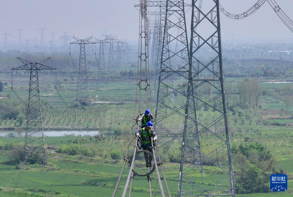 4月9日,在位于安徽省合肥市庐江县郭河镇的直流±800千伏建苏线3418号杆塔处,国网合肥供电公司工人进行高空检修作业(无人机照片)。