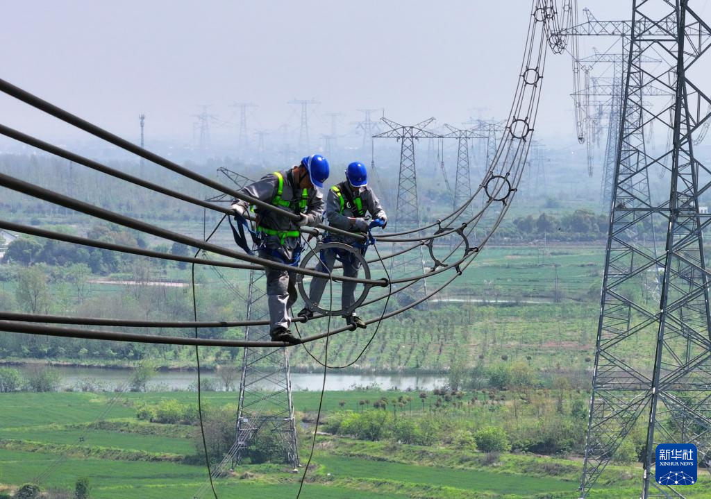 4月9日,在位于安徽省合肥市庐江县郭河镇的直流±800千伏建苏线3418号杆塔处,国网合肥供电公司工人进行高空检修作业(无人机照片)。