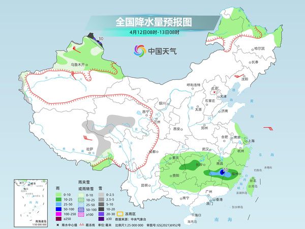 后天,新疆北疆北部和沿天山地区、西藏东部、青海南部等地部分地区有小到中雪或雨夹雪,其中,新疆北疆北部的部分地区有大到暴雪,局地大暴雪(20~30毫米)。贵州西北部、湖南中部、江西中部、福建中部等地部分地区有中到大雨,其中,江西东部的部分地区有暴雨。