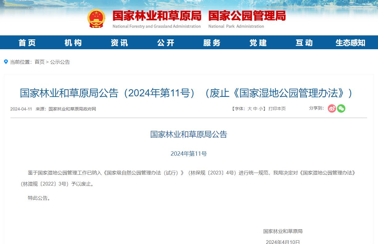 国家林业和草原局发布公告2024年第11号,鉴于国家湿地公园管理工作已纳入《国家级自然公园管理办法(试行)》(林保规〔2023〕4号)进行统一规范,决定对《国家湿地公园管理办法》(林湿规〔2022〕3号)予以废止。