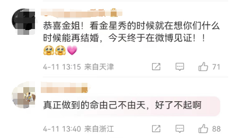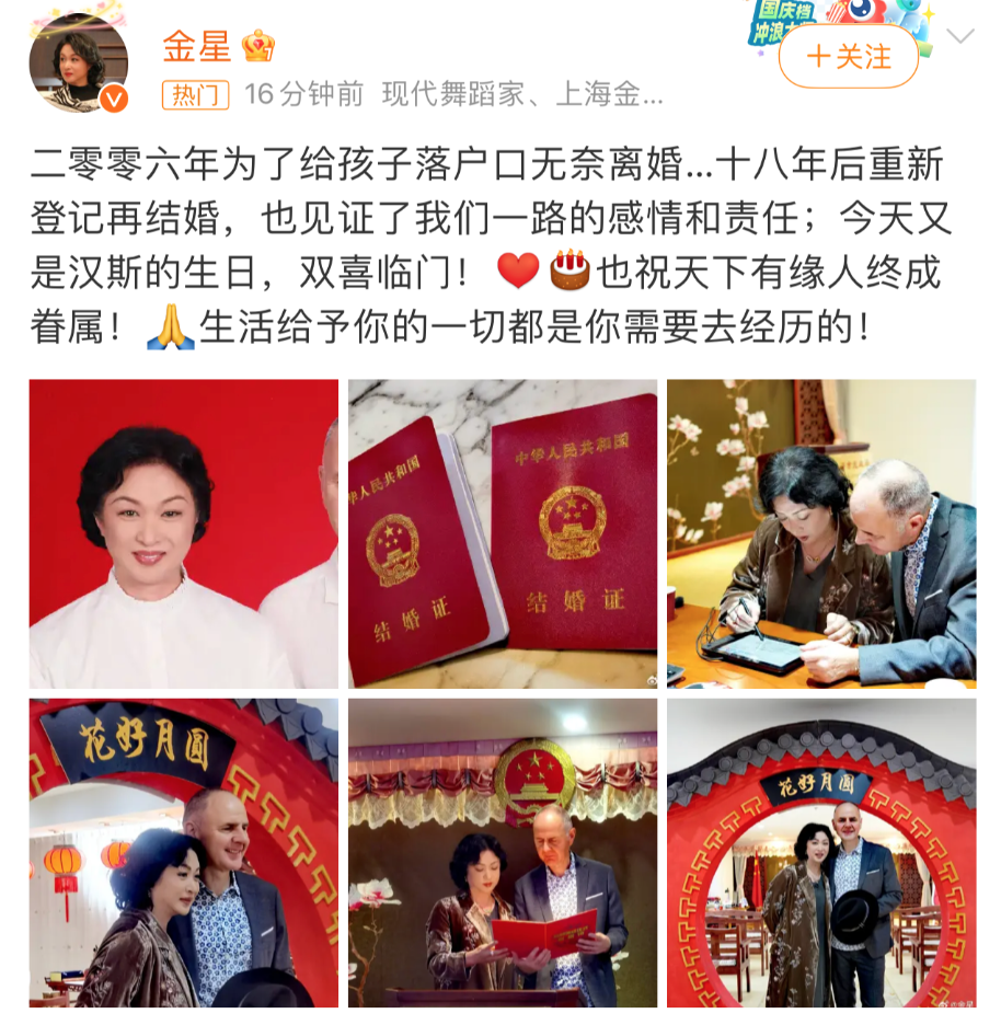 4月11日,@金星 宣布和老公汉斯重新登记结婚,“二〇〇六年为了给孩子落户口无奈离婚。十八年后重新登记再结婚,也见证了我们一路的感情和责任;今天又是汉斯的生日,双喜临门!也祝天下有缘人终成眷属!生活给予你的一切都是你需要去经历的!”