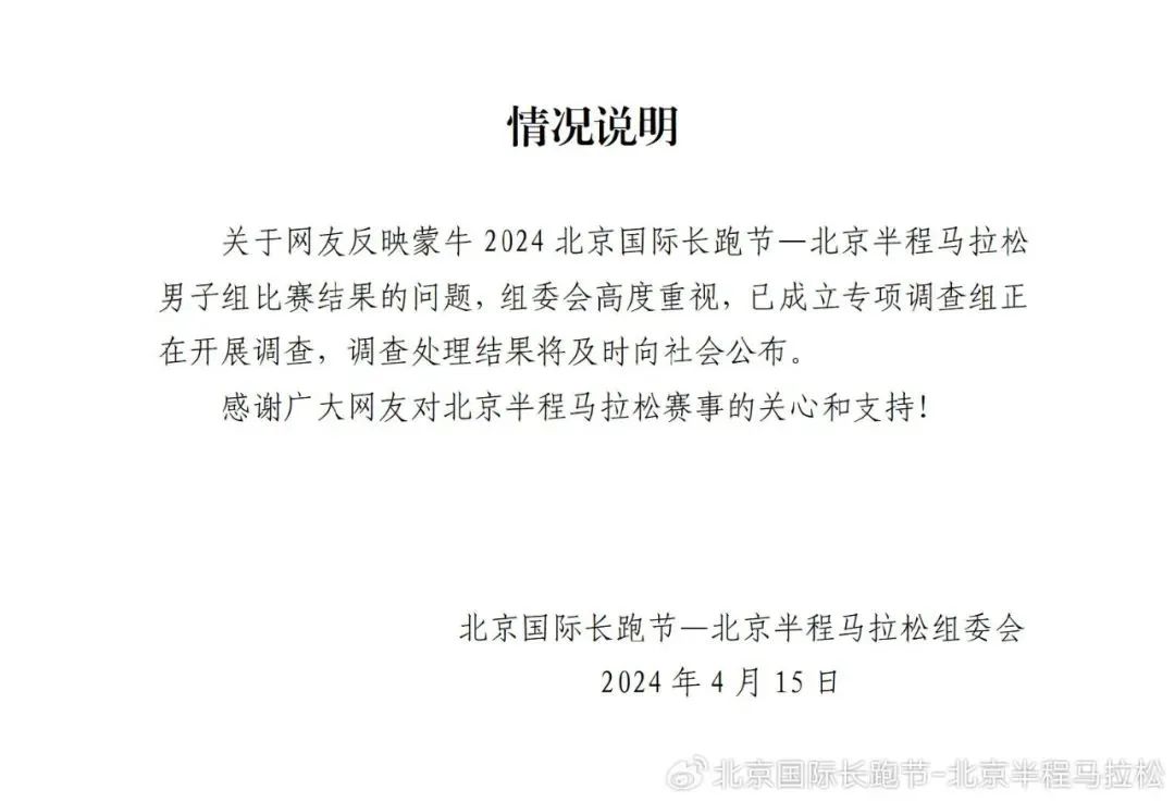 15日,北京国际长跑节—北京半程马拉松组委会发布通报:关于网友反映蒙牛2024北京国际长跑节—北京半程马拉松男子组比赛结果的问题,组委会高度重视,已成立专项调查组正在开展调查,调查处理结果将及时向社会公布。