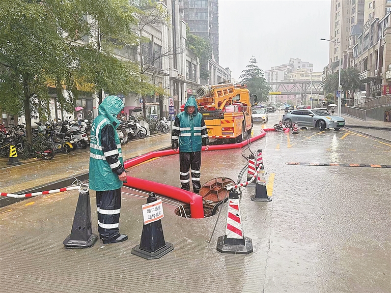 龙华排水公司调度防汛人员、应急抢险车辆值守易涝点。