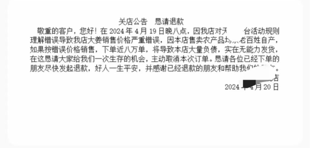 央广网北京4月23日消息 近日,某购物平台的一家农产品网店发布关店公告称,因对平台活动规则理解错误,导致店内生姜销售价格标错,被下单近8万单。若按照错误价格销售,将导致大量负债,恳请已经下单的买家尽快发起退款。公告发布后,迅速引起了网友的关注和热议。