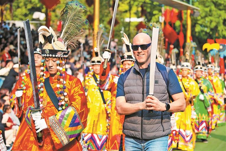 外籍游客沉浸体验深圳锦绣中华·民俗村的巡游活动。(受访景区供图)