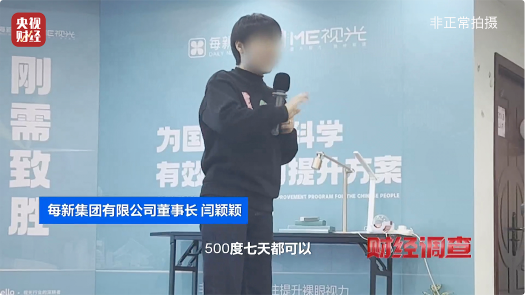 记者参加了ME视光视力提升摘镜中心的总公司——每新集团有限公司招揽加盟商的培训体验课。在招商培训现场,每新集团有限公司董事长闫颖颖宣称:500度七天都可以摘眼镜,18岁以内的,我们都可以做到。