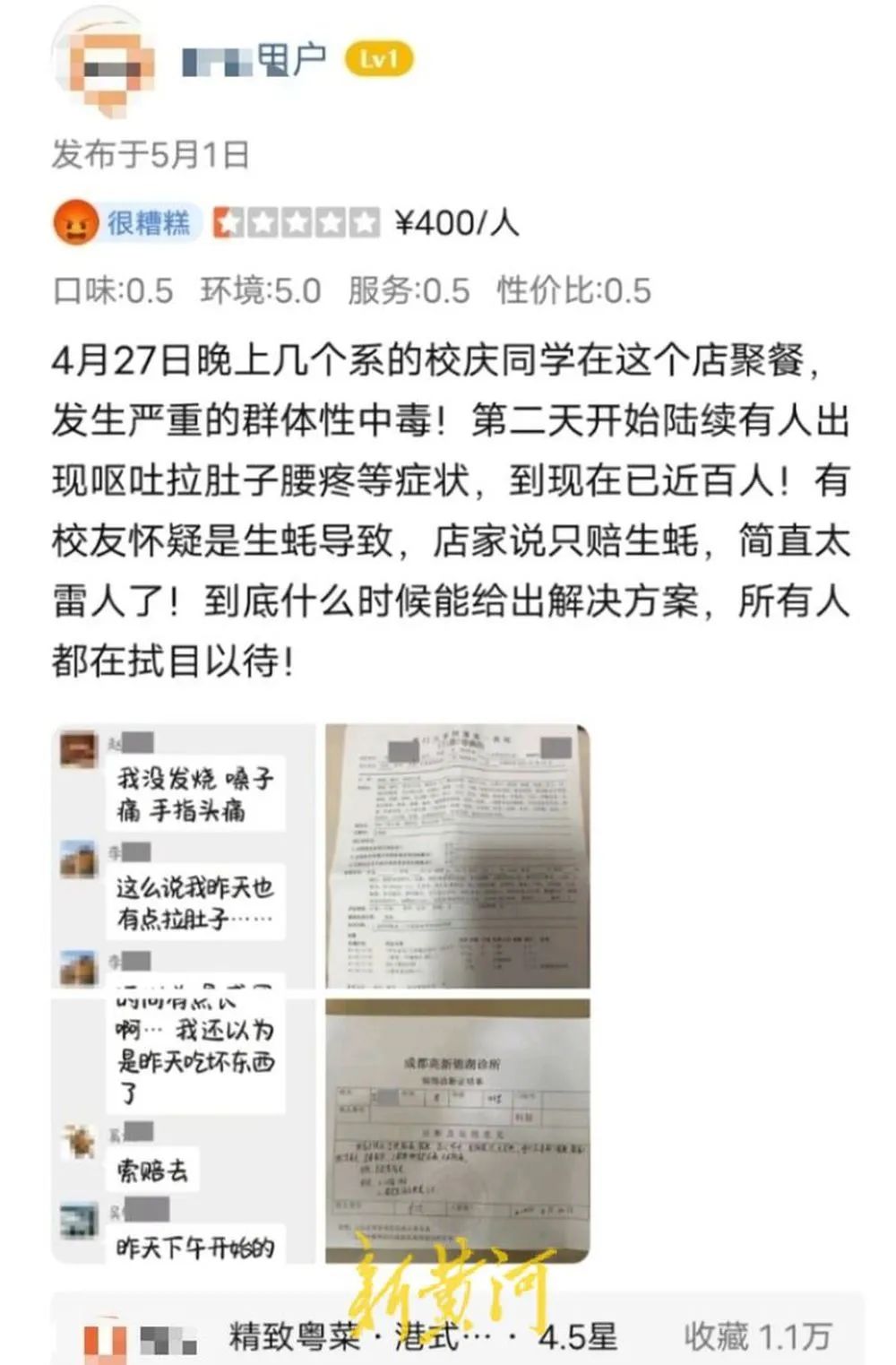 5月4日,有清华大学的校友告诉新黄河记者,已经向北京市场监督管理部门举报,疾控中心也已经介入此事。他还提到,“餐厅不仅没有道歉,而且敷衍了事不作为,完全没有对食品安全、客户的身体健康有着基本的尊重,缺失职业操守,很难想象这样一家餐厅能够在北京五道口经营这么多年。”