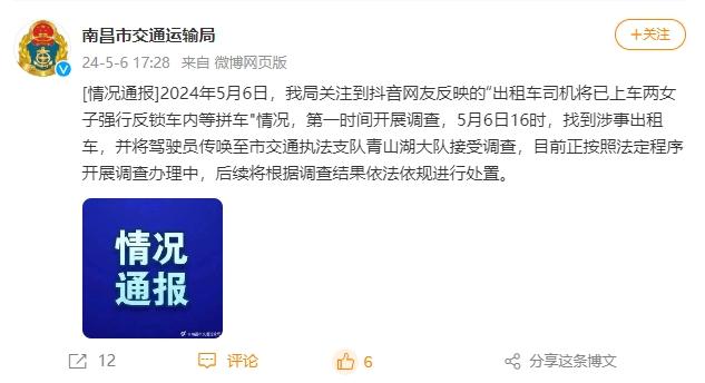 江西省南昌市交通运输局6日通过官方微博发布情况说明称,2024年5月6日,南昌市交通运输局关注到抖音网友反映的“出租车司机将已上车两女子强行反锁车内等拼车”情况,第一时间开展调查,5月6日16时,找到涉事出租车,并将驾驶员传唤至市交通执法支队青山湖大队接受调查,目前正按照法定程序开展调查办理中,后续将根据调查结果依法依规进行处置。