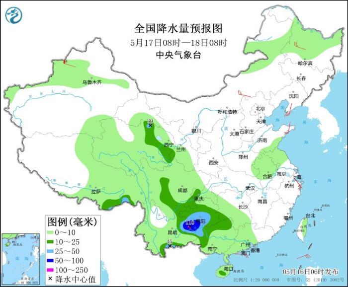 图1 全国降水量预报图(5月16日08时-17日08时)