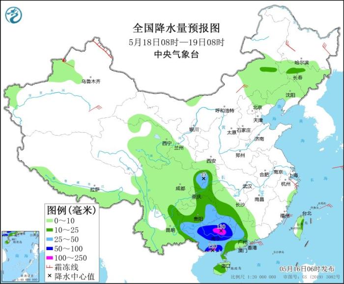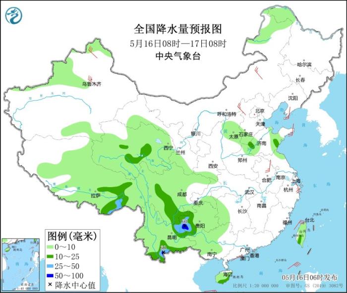 预计,5月16日至17日,西南地区南部、华南西部等地有分散性强降水。贵州、云南中东部、广西西部和北部、海南岛等地有中到大雨,其中,贵州西部和南部、云南东部和南部、广西西部局地有暴雨或大暴雨。上述部分地区伴有短时强降水(最大小时雨量20~40毫米,局地可超过50毫米),局地有雷暴大风等强对流天气。