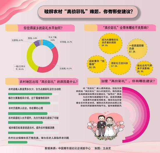 近年来,为给农村彩礼“降温”,中央文件多次提及推进高额彩礼综合治理,减轻农村青年的婚嫁负担。近日,中国青年报社社会调查中心联合问卷网 (wenjuan.com),对1333名青年进行的一项调查显示,破解农村高价彩礼,49.9%的受访青年建议对实行低彩礼、“零彩礼”的新人提供婚后就业、创业支持,47.9%的受访青年建议将拒绝高价彩礼纳入村规民约,移风易俗。