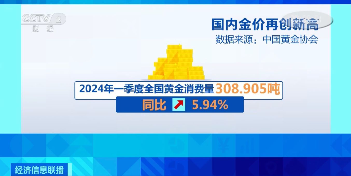 中国黄金协会的数据显示,今年一季度,全国黄金消费量308.905吨,比2023年同期上涨5.94%。业内人士表示,受美联储降息预期、中东地缘政治风险等因素影响,金价的避险属性充分发挥。此外,全球央行持续大额购金或将对金价起到推动作用。