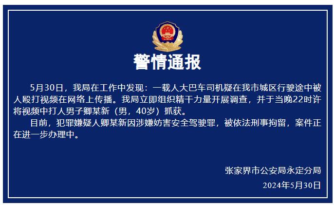 据永定公安官微消息,张家界市公安局永定分局通报,5月30日,该局在工作中发现:一载人大巴车司机疑在市城区行驶途中被人殴打视频在网络上传播。警方立即组织精干力量开展调查,并于当晚22时许将视频中打人男子卿某新(男,40岁)抓获。