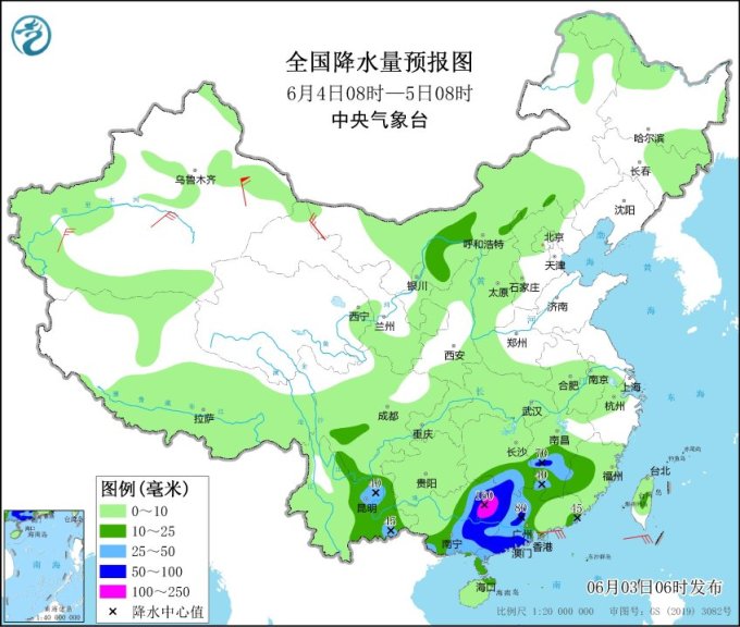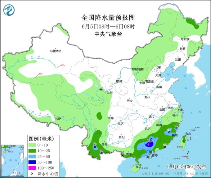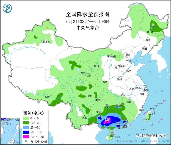 中央气象台3日早晨继续发布暴雨蓝色预警:预计未来三天,两广地区将再度成为暴雨集中地,广西中东部、广东西部和北部、湖南南部、江西南部等地部分地区有暴雨、局地大暴雨,福建、云南中东部等地有中到大雨。其中今天白天至夜间,广西、广东中西部、湖南南部等地部分地区有大雨到暴雨,广西中部等地部分地区有大暴雨(100~180毫米);上述部分地区伴有短时强降水(最大小时降雨量20~50毫米,局地可超过70毫米),局地有雷暴大风等强对流天气。