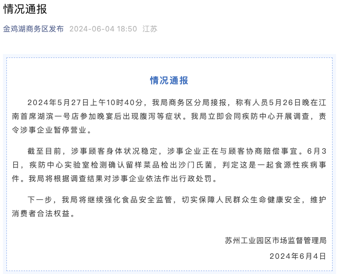 据苏州工业园区市场监督管理局通报,5月27日上午10时40分,商务区分局接报,称有人员5月26日晚在江南首席湖滨一号店参加晚宴后出现腹泻等症状。该局立即会同疾防中心开展调查,责令涉事企业暂停营业。