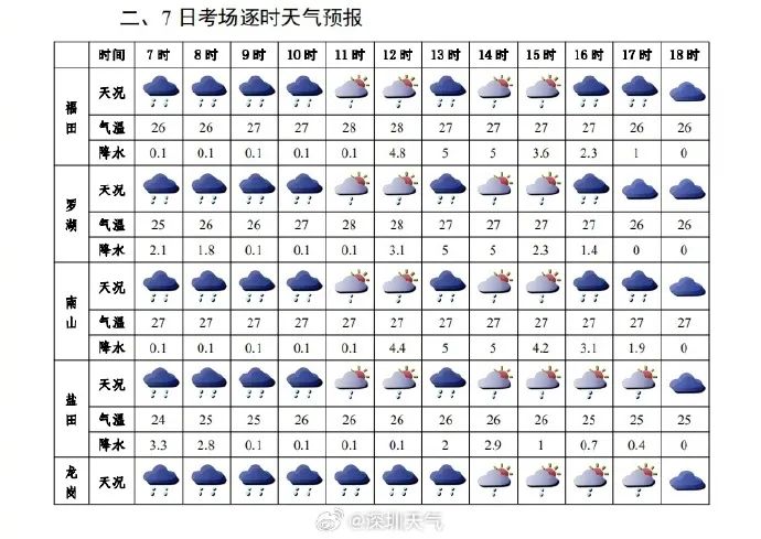 今早高考赴考时段,深圳以阴天为主,间中有分散阵雨,大鹏新区局地雨势较大,局地累计雨量可达暴雨,7日深圳整体气温25-27℃,出门需携带雨具。