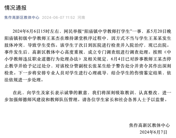 近日,河南焦作一家长实名举报,称孩子在校内被老师殴打,医院诊断为颅内损伤,引发关注。6月7日,焦作高新区教体中心发布情况通报称,6月6日15时左右,网民举报“阳庙镇中学教师打学生”一事,系5月20日晚阳庙镇初级中学教师王某杰在维持课堂秩序过程中,因方式不当与学生王某某发生肢体冲突,导致学生受伤。该学生于次日到医院进行检查并入院治疗,现已出院。事件发生后,高新区教体中心高度重视,成立专门调查组进行调查处理。按照《中小学教师违反职业道德行为处理办法》及相关规定,6月4日已对涉事教师王某杰停止教学并给予记过处分,对该校分管副校长张某生给予警告处分并责令其作出深刻检查。下一步将安排专业人员对学生进行心理疏导,结合学生的伤情鉴定结果,依法依规进一步处理。