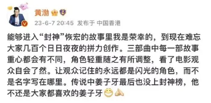演员黄渤微博反对“撕番位”。微博截图