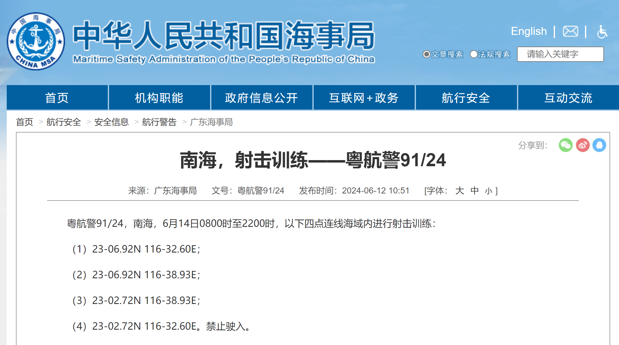 记者从中国海事局获悉,南海局部海域将于6月14日8时至22时进行射击训练。训练海域的具体位置在以下四点连线内: