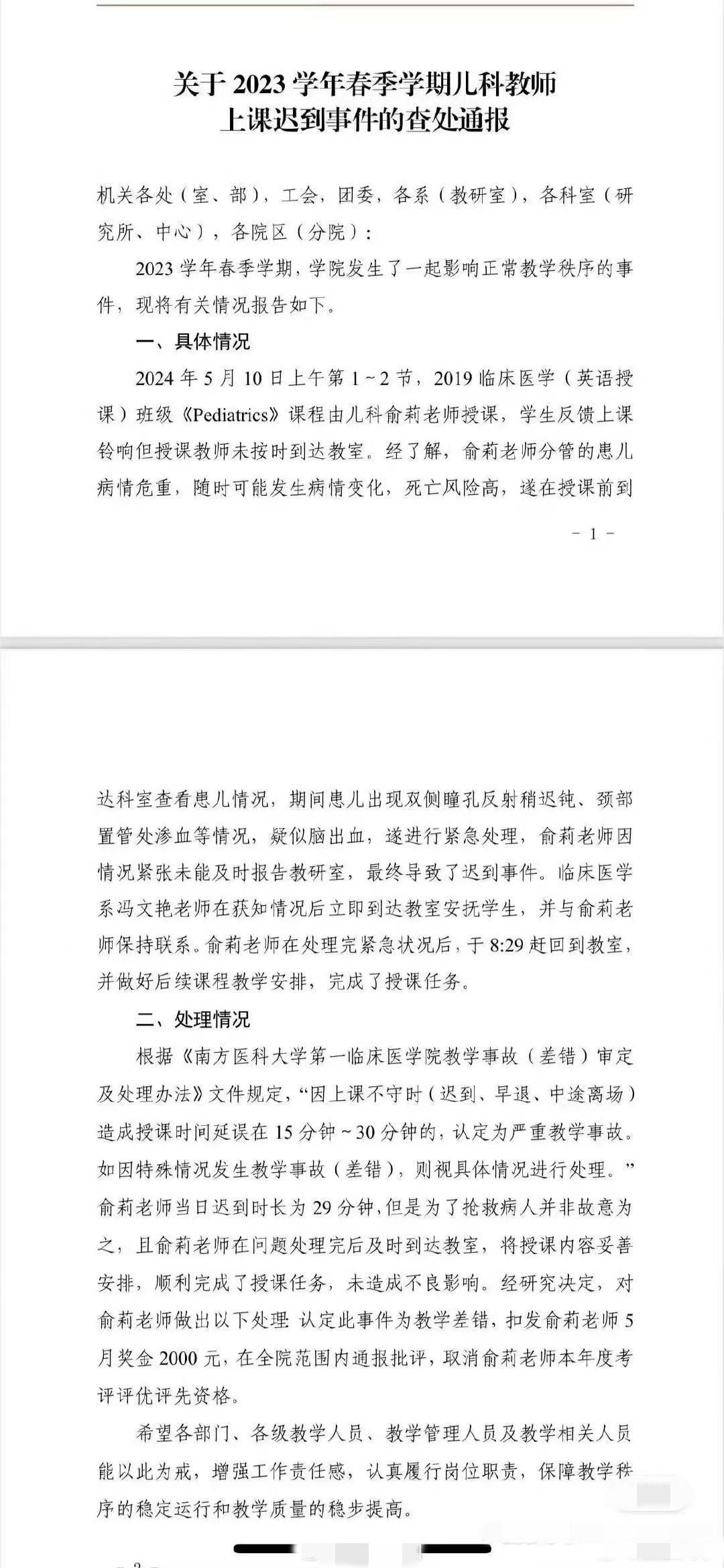 根据通报,俞莉授课迟到被认定为教学差错,处理结果为扣发5月奖金2000元、在全院范围内通报批评、取消本年度考评评优评先资格。通报称:“当日迟到时长为29分钟,但是为了抢救病人并非故意为之,且俞莉老师在问题处理完后及时到达教室,将授课内容妥善安排,顺利完成了授课任务,未造成不良影响。”