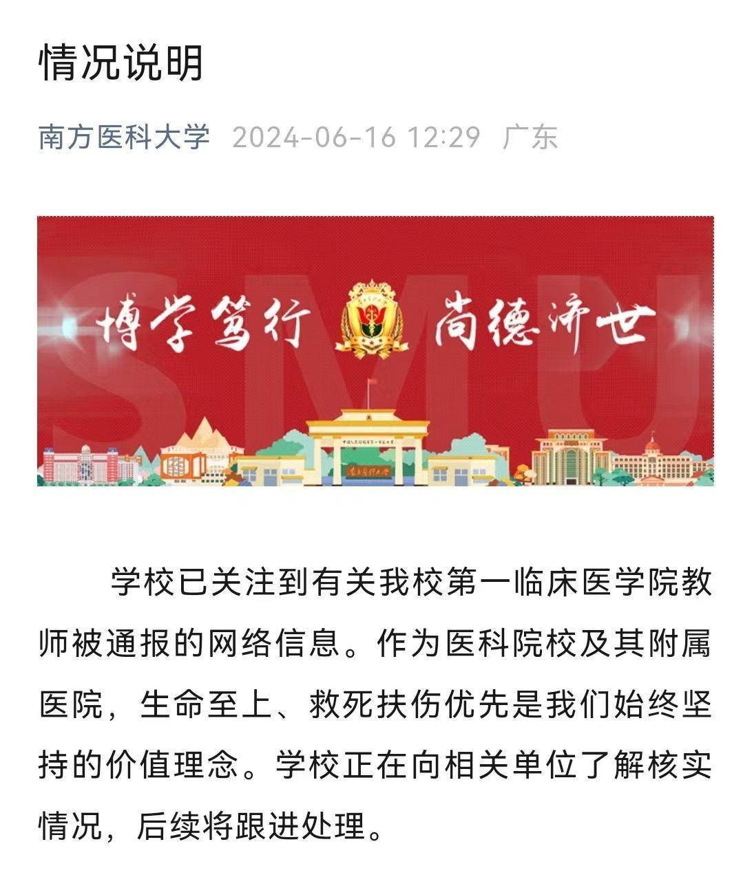 6月16日中午,南方医科大学微信公众号发布一则“情况说明”: 学校已关注到有关我校第一临床医学院教师被通报的网络信息。作为医科院校及其附属医院,生命至上、救死扶伤优先是我们始终坚持的价值理念。学校正在向相关单位了解核实情况,后续将跟进处理。