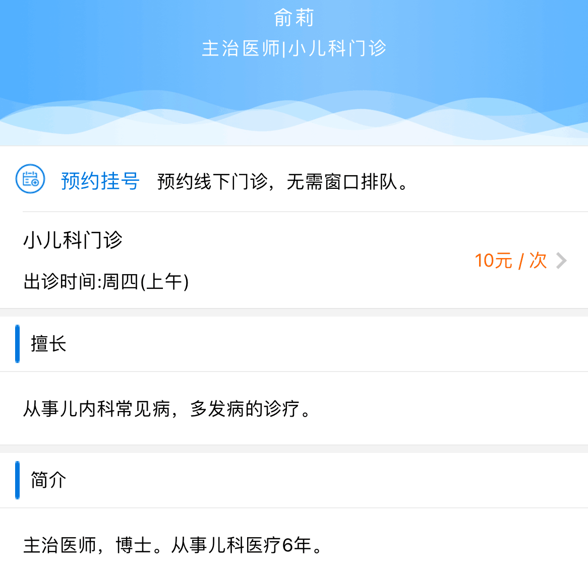 现代快报记者在南方医科大学南方医院微信公众号上看到,俞莉为小儿科门诊主治医师,从事儿科医疗6年,是博士。擅长儿内科常见病,多发病的诊疗。6月20日下周四上午出诊。