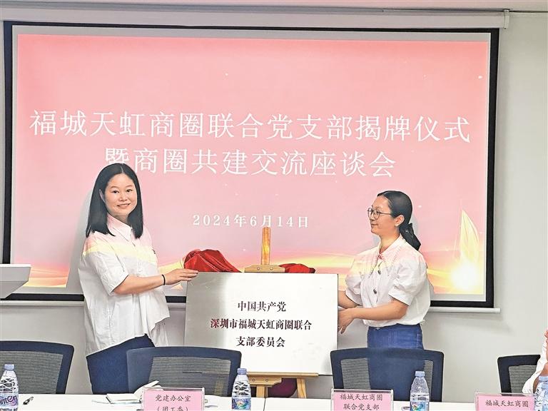 龙华新闻讯(记者 黄晓华 通讯员 符春荣/文 记者 陈建华/图)6月14日下午,在福城天虹商圈,福城街道两新党工委举行福城天虹商圈联合党支部揭牌仪式暨商圈共建交流座谈会。福城街道经济服务、工青妇、物管办、安全生产等8个相关部门、商圈物业、商户代表、小区物业代表支部及属地社区共同见证。