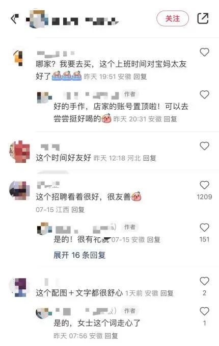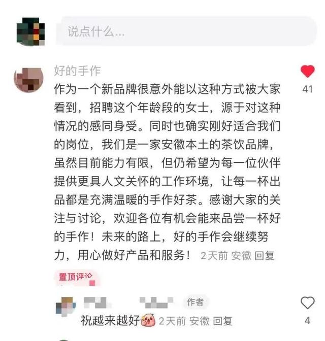 记者在评论里看到,这家奶茶店也有留言,留言里写道:招聘这个年龄段的女士,源于对这种情况的感同身受。同时也确实刚好适合我们的岗位,我们是一家安徽本土的茶饮品牌,虽然目前能力有限,但仍希望为每一位伙伴提供更具人文关怀的工作环境,让每一杯出品都是充满温暖的手作好茶。