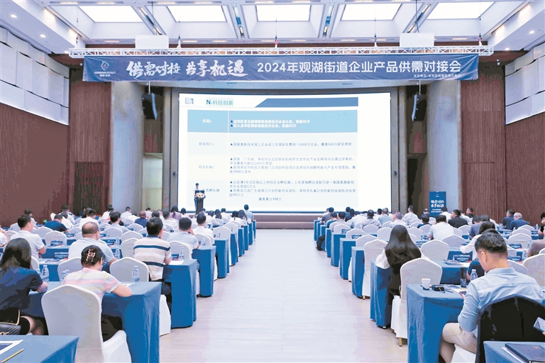 据介绍,观湖位于梅观科技创新走廊“黄金产业发展线”的重要节点,作为联南接北、承东启西的区域科创、服务、产业、交通中心,科创资源与科创地位十分突出,已形成以宝德科技、杰普特光电为代表的数字经济产业;以华润三九为代表的生物医药产业;以汇川技术、海辰储能、博科能源为代表的新能源产业;以广东容祺智能科技有限公司、深圳市易天富电子有限公司为代表的低空经济产业;以国瓷永丰源为代表的现代时尚产业。辖区拥有四上企业596家,国家专精特新“小巨人”企业10家,市级以上专精特新企业219家,上市公司11家,新三板企业5家,国高企业410家,市场主体近5万家。