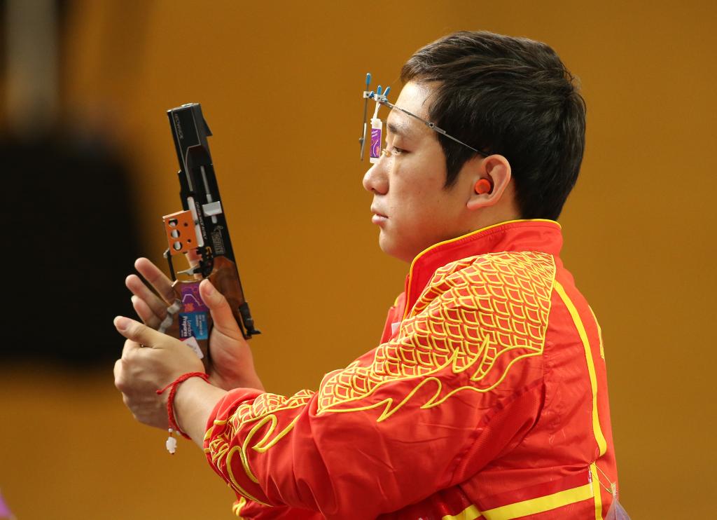 2016年8月13日,在里约奥运会男子25米手枪速射决赛中,李越宏以27中的成绩获得铜牌。新华社记者 曹灿 摄