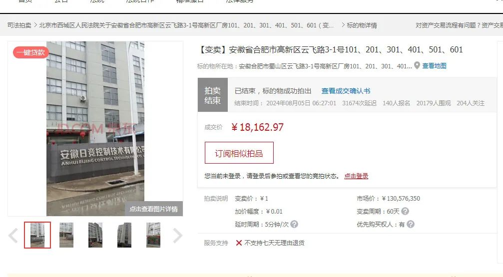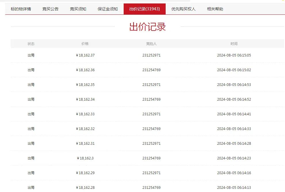 从1元起开始变卖,经历了2天多的竞价,8月5日06:10:13竞价结束时,本次司法变卖的延迟次数高达31674次。